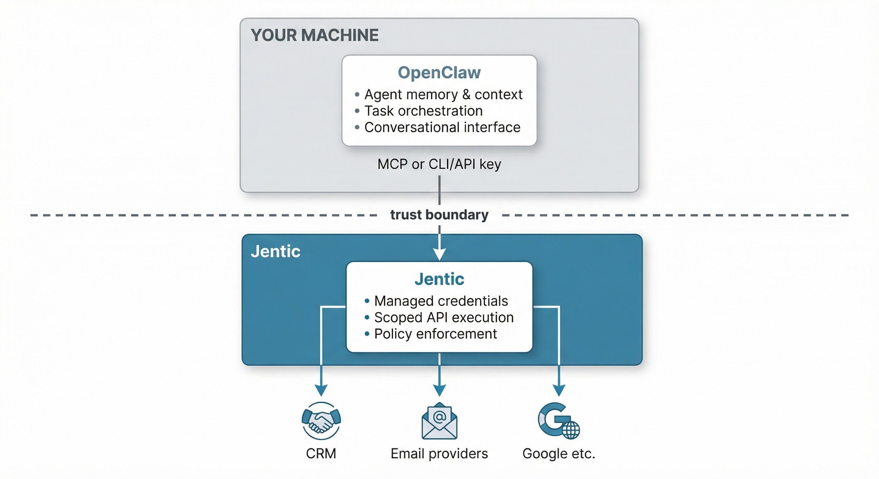 It's worth noting that OpenClaw founder Peter Steinberger himself has been vocal about not building native MCP support into the agent. In his recent Y Combinator interview, he said he "totally skipped the MCP crap" and prefers letting agents use CLIs directly, calling it more flexible and scalable. Fair enough. Jentic works either way. McCann's team connects through MCP where it makes sense, but if you'd rather skip MCP entirely, you can generate a Jentic API key and provide it directly to OpenClaw. Your agent calls Jentic through the CLI, Jentic handles credentials and execution on the other side, and you get all the same security benefits. The integration path is flexible. The principle is the same: OpenClaw orchestrates locally, Jentic executes externally.